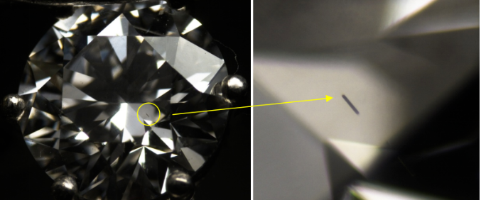 图4左图为实验室培育钻石样品;右图为放大条件下观察可见棒状金属包体