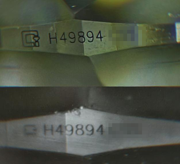图3上为仿冒刻字,下为珠宝国检(NGTC)上海实验室样品刻字图