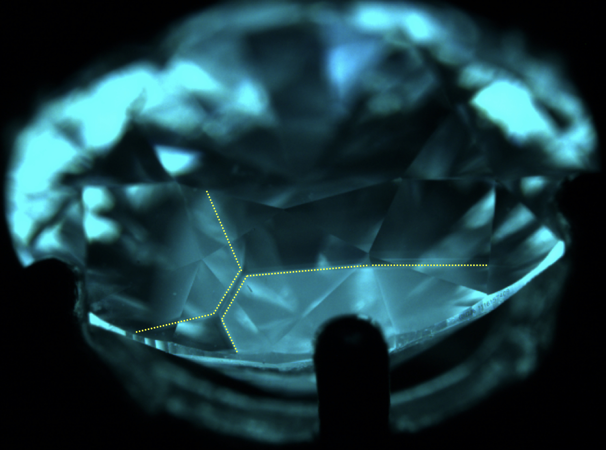 图5荧光观察图像,黄色虚线所示高温高压合成钻石生长分区