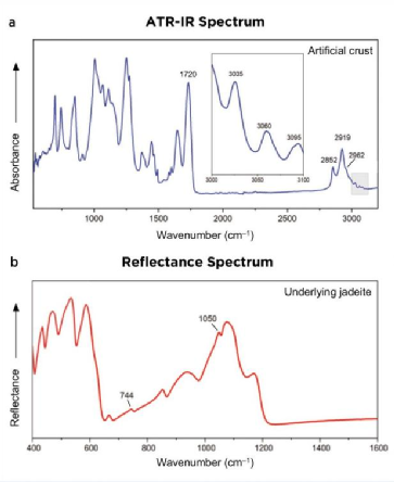 使用红外光谱仪以衰减全反射率法(ATR)和漫反射法进行测试,测试谱图如图4所示。如图4a可知外层蜡皮壳在1500-2000cm-1范围内具有吸收带,与蜡的特征相收相似,同时在2852、2919、2962、3035cm-1处出现与环氧树脂有关的特征吸收。在皮壳脱落部位进行漫反射测试,如图4b所示在744和1050cm-1处有吸收峰,以及400-600 cm-1之间的四个谱带,这与硬玉的特征吸收一致。这种人造皮壳可通过其低硬度,异常的紫外荧光和红外光谱检测等手段来进行检测区分。